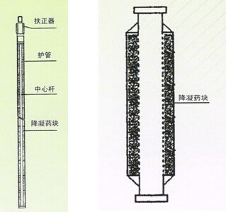 筒式防蠟器內(nèi)裝有固體防蠟降凝劑,連接在抽油桿或油管上用于油井中防止結(jié)蠟。